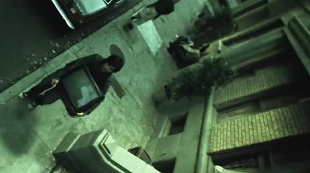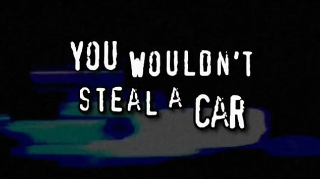 The crime-thriller styled video displays messages like "You wouldn't steal a car, you wouldn't steal a handbag" set against a loud musical score.